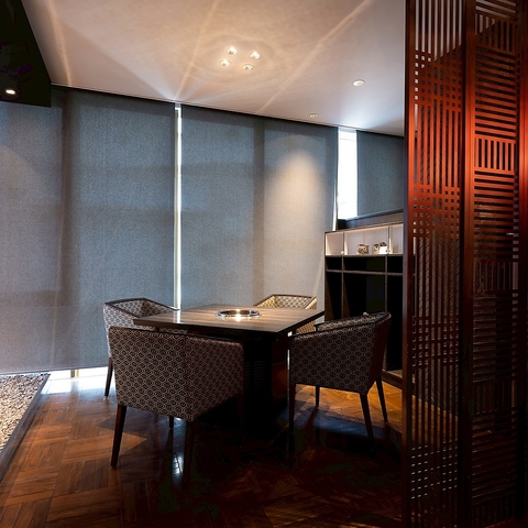 間接照明が心地よいプライベート感溢れるテーブル席でございます。格子状の仕切りが、周囲の視線を遮り、落ち着いた空間を演出いたします。4席が1卓完備されており、大切なご接待やご会食、少人数での特別な記念日のお食事に最適です。