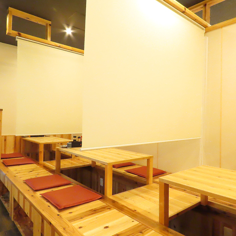 【ロールカーテンで半個室に◎】お子様連れのご家族にも大変おすすめな座敷席もご用意しております。ロールカーテンの使用で「半個室」にすることもできる多才なお席です。また、座敷席は禁煙となっておりますので、20歳以下のお客様やお子様も安心してご利用いただくことができます。