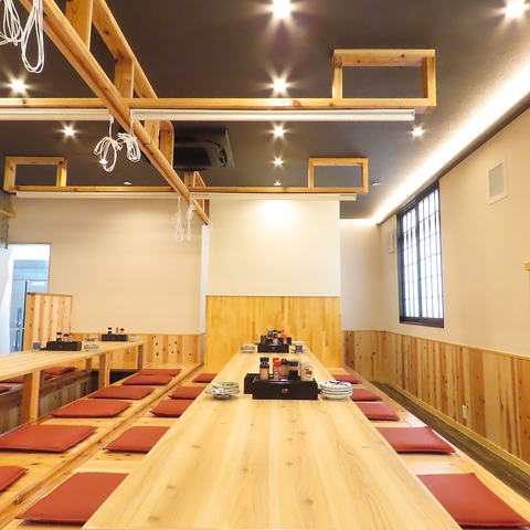 温かな木のぬくもりを感じながら、ゆったり寛げる「掘りごたつ席」をご用意。ご宴会時には最大55名様がご利用できる宴会場に、そしてロールカーテンを使用すれば少人数で楽しめる「半個室席」にすることも可能です。会社帰りの同僚とお立ち寄りいただいたり、ご友人同士で飲み会を満喫したり、使い方は自由自在です。