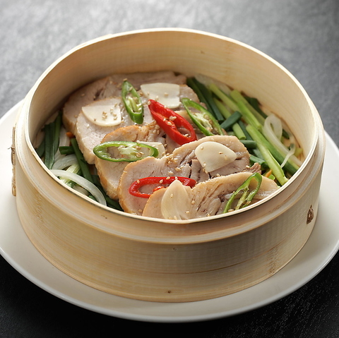 せいろで蒸した豚肉を、包み野菜と一緒に。