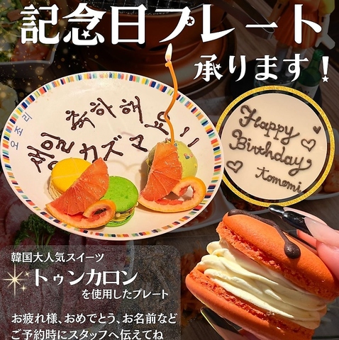 お誕生日や記念日に、韓国スイーツを使用したプレートをご用意しております。メッセージを伝えてね!