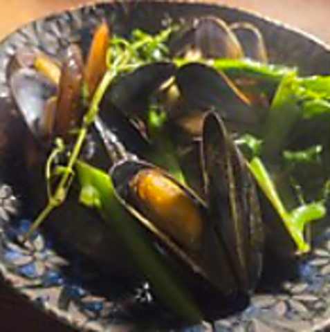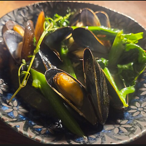 ムール貝と徳島県産つるむらさきの白ワイン蒸し ハーブの香り