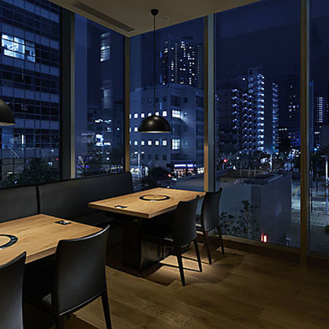 モダンで洗練された空間が広がる店内は、夜景を望む大きな窓が印象的。照明が落ち着いた雰囲気を演出し、特別なひとときを彩ります。
