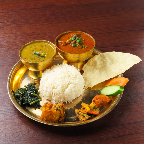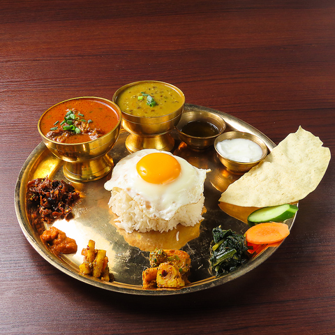 スパイスカレーに、目玉焼き・チャトニ(スパイスペースト)・ミックスピクルス・青菜炒め・野菜のおかず(タルカリ)・ヨーグルトまで盛り込んだ、ネパールの定番ランチセット!様々なおかずを混ぜて食べるのが本場流。スパイス初心者にもおすすめの“食べる楽しさ”が詰まった一皿です。