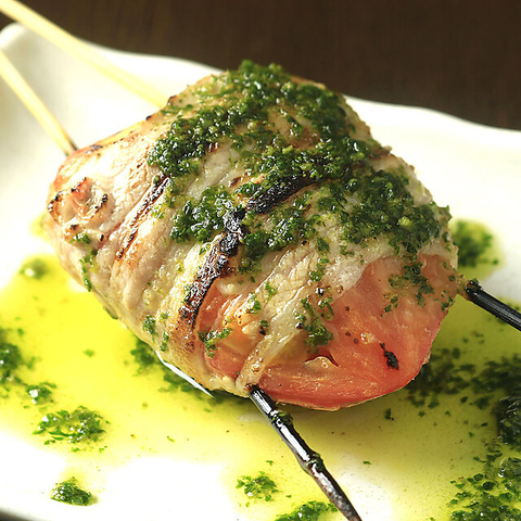 松介名物の創作串!見た目も華やかで女子会やデートにもぴったりです。赤と白のコントラストが美しい串を一口食べれば、パリッと焼けた豚肉の中から、とろけるチーズと弾けるトマトの旨味が溢れ出します。南阿蘇のバジルの香り豊かなジェノベーゼソースが加わり奥深い味わいです。