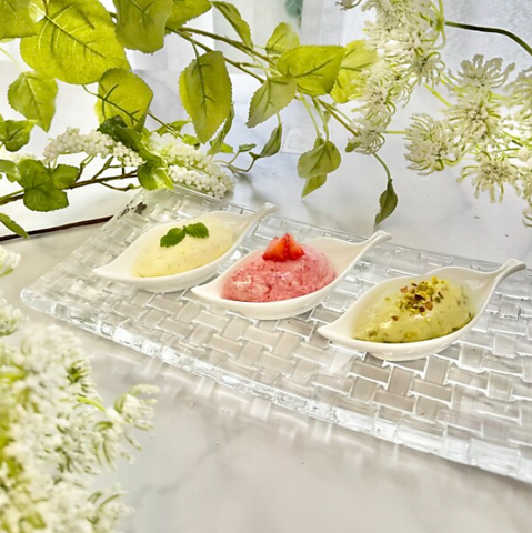 アイスクリーム(チョコレート、バニラ、ピスタチオ)ソルベ(イチゴ、パイナップル、柚子)からお好きなフレーバーを3つお選び下さい。