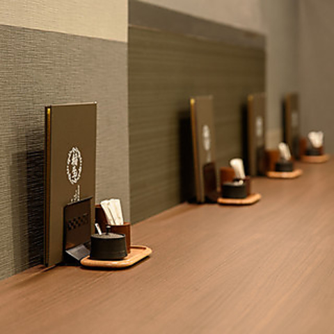 和モダンの魅力を存分に感じられる空間。エントランスは広々とした造りで、出張や観光で訪れる方々が気軽に入店できるよう配慮。ひつまぶしを一人でも楽しめるカウンター席は、気軽さと温かみを兼ね備えています。心からのおもてなしで、一期一会の出会いを大切にし、皆様をお迎えする準備が整っています♪英語・中国語のメニューもご用意。