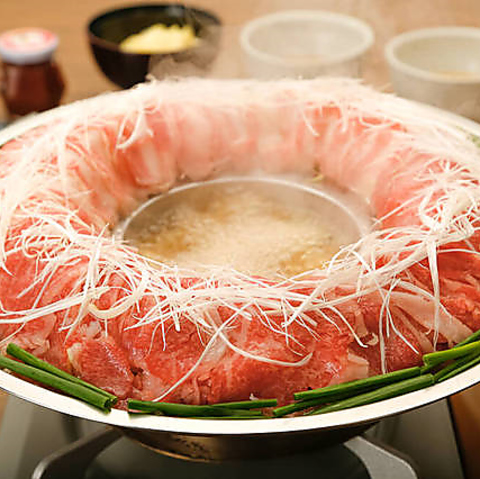 “九州産黒毛和牛サーロイン×鹿児島黒豚”の炊き肉鍋コースになります。黒毛和牛の最上部位と呼ばれているサーロインと鹿児島黒豚のブランド豚“黒宝豚”をハーフでお召し上がり頂けるお薦めのコースです。