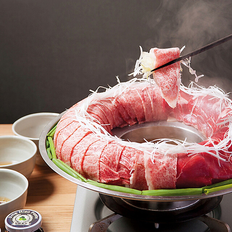 特許取得のドーナツ型鍋を使用する博多炊き肉鍋。和牛の旨味が凝縮したテールスープと、細切りねぎが特徴。