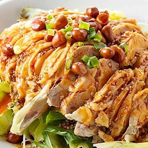程よい火加減で調理した“よだれ鶏”は、柔らかくジューシーで絶品です。胡麻と黒酢が効いた甘辛いたれに特製のラー油がアクセントになっており、鶏との相性は抜群。