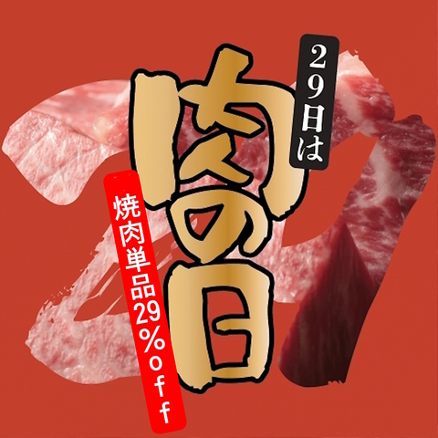 毎月29日は「肉の日感謝DAY」として、焼肉メニュー全品がなんと29%OFF!神戸牛はもちろん、村田牛や特選村田牛、ホルモンまで各種が対象です♪この絶好の機会に、贅沢なお肉をお得に味わってみませんか?ただし、コース料理やセットメニュー、肉鍋などは割引の対象外となりますのでご注意ください!
