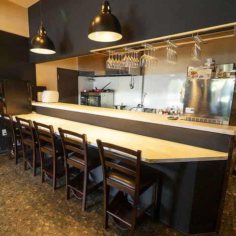 【カウンター席:5席】当店のカウンター席は、まさに大人の隠れ家としてお二人の会話を楽しみながら、お食事を堪能できる理想的な場所です。近い距離感が生み出す親密な雰囲気の中で、目の前で仕上げる料理を楽しむことができ、心温まる時間をお過ごしいただけます。