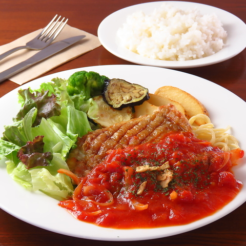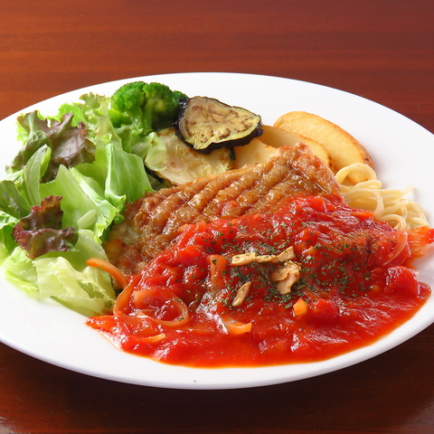 チキンステーキトマトガーリックソースは、満足感のある大きなお肉が特徴で、当店の人気メニューの一つです。手作りのトマトソースは、フレッシュな味わいが楽しめ、お肉との相性も抜群です。食べ応えのある一皿をぜひご賞味ください!ジューシーなチキンとソースの絶妙なハーモニーをお楽しみいただけることでしょう◎