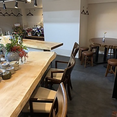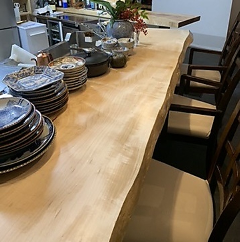 | カウンター | 4名様×1 | 古いもので江戸時代に焼かれた骨董皿が並ぶ栃の木の一枚板カウンター |
