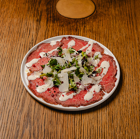 低温調理した旨味の濃い赤身肉。ヴェネツィア発祥のカルパッチョスタイルで。