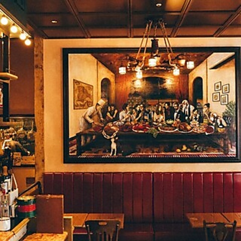 店内に足を踏み入れると、まるで絵画の中に迷い込んだかのような感覚に包まれます。壁にはダイナミックな絵画が描かれ、食事を共にする人々の楽しげな様子が描写されています。赤い革張りのソファが並び、温かみのある照明が心地よい雰囲気。友人や家族と過ごす時間が、より一層特別なものに感じられる空間です。