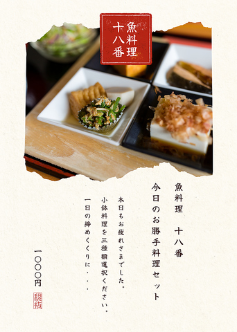 毎日変わるメニューは女将の仕入れ次第。1000円、1500円、2000円のセットからお選びいただけます。1000円は軽く飲みたい方に、1500円は小腹を満たしてくれる、2000円は旬の味を少しずつ楽しめます。美味しいお魚料理をご堪能ください!