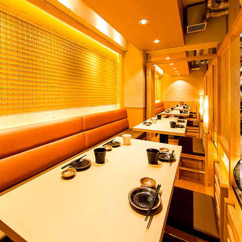 木の温もりに包まれた落ち着いた空間。高めの仕切りでしっかりとプライベート感が保たれ、周囲を気にせずゆったり食事が楽しめます。デートや少人数飲み会にぴったり。