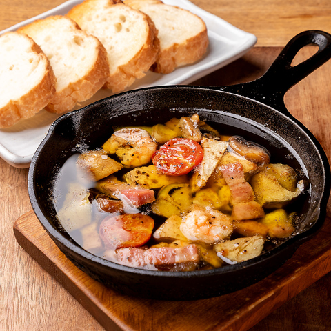 えび、マッシュルーム、ベーコン、カマンベールチーズなどなど具だくさんです!おかわりバケット…275円(税込)