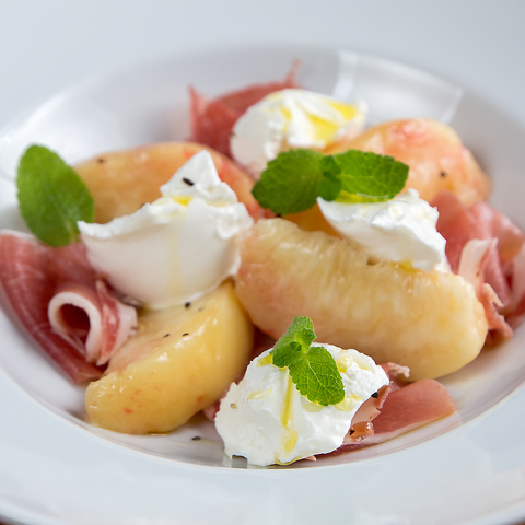季節のフルーツを使った“生ハムとマスカルポーネ”は、甘じょっぱさがクセになる人気の前菜!とろ~りマスカルポーネに、ジューシーなフルーツ、旨みたっぷりの生ハムが相性抜群♪ワインと一緒に、ちょっと贅沢なひとときを楽しんでみては?