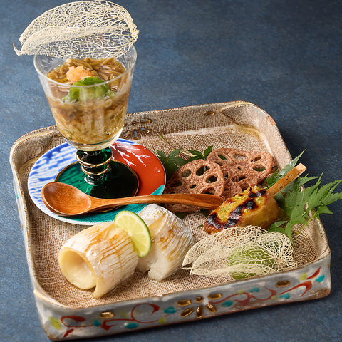 京都の中央市場から仕入れた旬の食材を使用した日替わりメニューを提供しています。その時期ごとに異なる美味しいネタを揃えているので、一度訪れたお客様も新たな発見をお楽しみいただけます。新鮮な食材を活かした料理は、目でも舌でも四季の移ろいを感じられて美味◎ぜひ、この機会にご賞味ください!