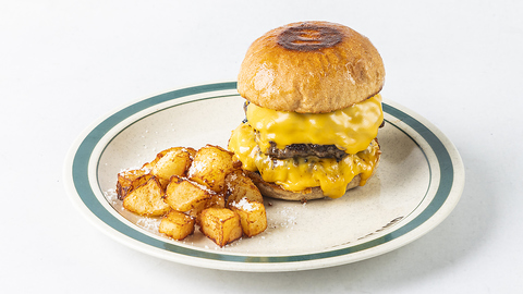 甘くとろけるオリジナル煮たまねぎと濃厚チェダーチーズの味わいが肉の旨みと見事にマッチしたハンバーガー【材料:パティ/チェダーチーズ/煮たまねぎ】