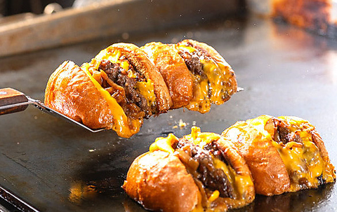 国産牛100%のパティからあふれ出る熱々の肉汁を切った断面に吸わせて、さらにその断面を2度焼きし肉汁の旨みを一層引き立てた極上の一品【材料:パティ/チェダーチーズ/煮たまねぎ/ピリ辛ソース】