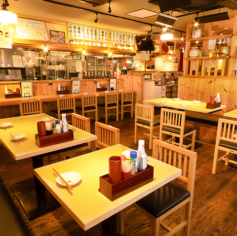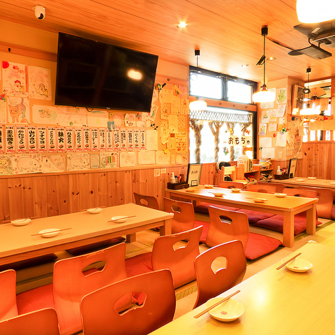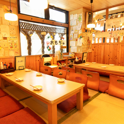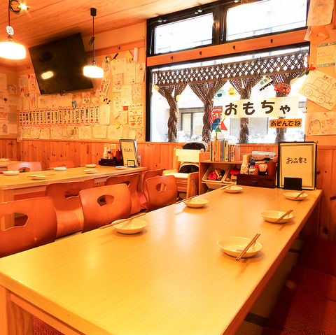 手書きのPOPやスタッフがモデルのポスターが飾られた、親しみやすい雰囲気が特徴の空間。広々としたお座敷席はお子様連れでも安心してご利用いただけ、おもちゃコーナーもございますので、お子様も飽きることなくお楽しみいただけます。ご家族でのお食事などにぜひご利用ください!