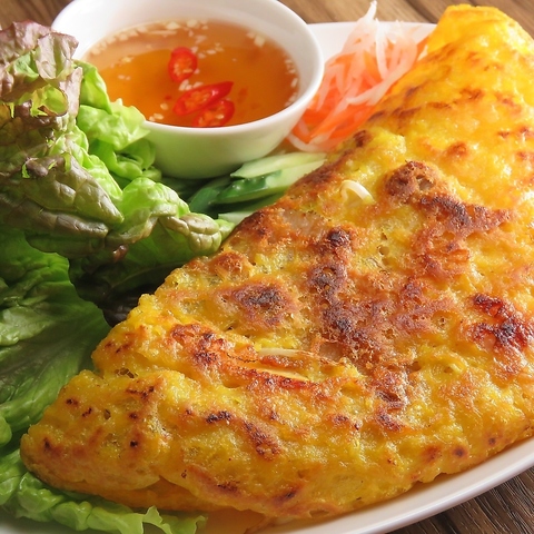 米粉でできたベトナムのお好み焼き「バインセオ」。中にはお野菜、お肉、海老などがたっぷり入っています。レタスでくるんで特製ダレを付けて豪快にお召し上がりください。ライスペーパーで巻いて食べるのもおすすめです!