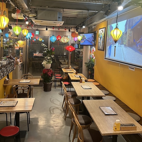 喧騒から離れた落ち着いた場所にあり、ゆっくりと食事をしたい方におすすめです 。店内はベトナムの雰囲気を再現した癒し空間となっており、日常の疲れを忘れさせてくれます 。温かみのある照明とベトナム風のインテリアが配置され、非日常的な空間で最高に楽しい時間をお過ごしいただけます 。