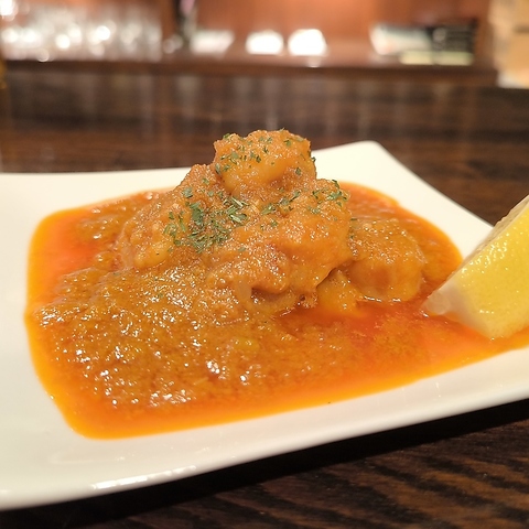 エビの身・ミソ・殻をすべて使ったガーリック・シュリンプです。濃厚なエビの風味をお楽しみください。付け合わせのレモンを絞って味変もおすすめです。追加150円(税込み)でバゲットもお付けできます。