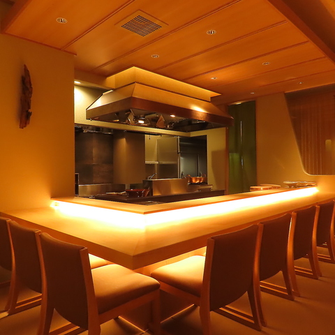 【木の温もりに包まれるような洗練された非日常空間】店内は「木漏れ日」をテーマに、木材と間接照明を巧みに使った落ち着いた空間。カウンター席では職人の手仕事を間近に感じられ、まるで劇場のような臨場感。静かで洗練された雰囲気が、特別なひとときを演出します。