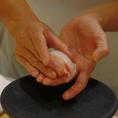 厳選したこだわりの旬の新鮮食材で作る旬の鮨はどれも絶品です。大将が皆様の目の前で、真心をこめて丁寧に握った鮨をご堪能いただけます。極上の食材を、癒しの空間で、大将の技が光る至極の一品一品、心ゆくまでご堪能ください。