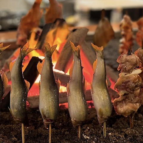 【旬の食材を囲炉裏で焼いてご提供】オープンカウンターでライヴ感もお楽しみいただけます。