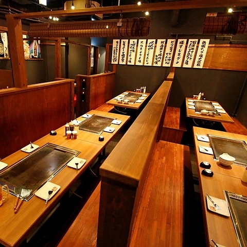 【和の趣あふれる空間】柔らかい照明の店内は、落ち着いた和の雰囲気でゆったりとくつろげます。鉄板付きのテーブル席が気分を盛り上げてくれます♪貸切もOKで、半個室風に仕切られているので周りを気にせずお食事をお楽しみいただけます。