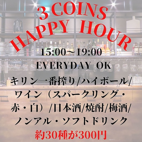 ≪15:00~19:00まで≫生ビールやスパークリング、ハイボールなど充実の30種類が300円で楽しめます