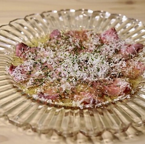 生でこそわかる、龍樹ビーフの本質。きめ細やかな赤身に、やさしく霜が差した龍樹ビーフを薄くスライス。オリーブオイルと岩塩、檸檬香るソースで仕立てた極上のカルパッチョです。