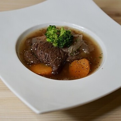 龍樹ビーフの上質な牛すじを、赤ワインと香味野菜でじっくりと煮込み、とろける柔らかさと濃厚な旨味を引き出しました。コク深いソースの中に、肉の繊維がほどけるごとに広がる芳醇な香り。ナイフのいらないやわらかさに、思わず笑みがこぼれるひと皿です。ワインとも、ごはんとも抜群の相性を誇る、肉の余韻を楽しむ逸品。