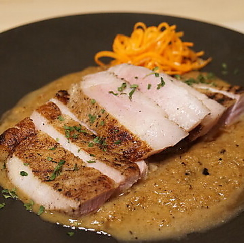 きめ細やかな肉質とやさしい脂の旨味が特徴の龍樹ポークを、香味野菜と特製生姜ダレでふっくら焼き上げた贅沢なジンジャーソテー。ひと口ごとに、香ばしさと肉の甘みがふわりと広がり、生姜の風味が余韻に心地よく残る、和の上質を感じる逸品です。