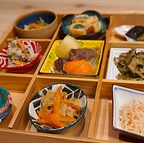 30年以上の和食割烹経験を持つ料理人が、厳選した食材を用いて四季折々のおばんざいを提供します。旬の素材を活かした9種のおばんざいはコースメニューに含まれます。こだわりのおばんざいを心行くまでお愉しみください。