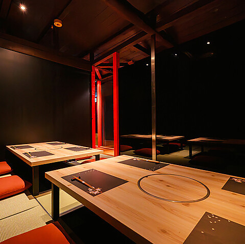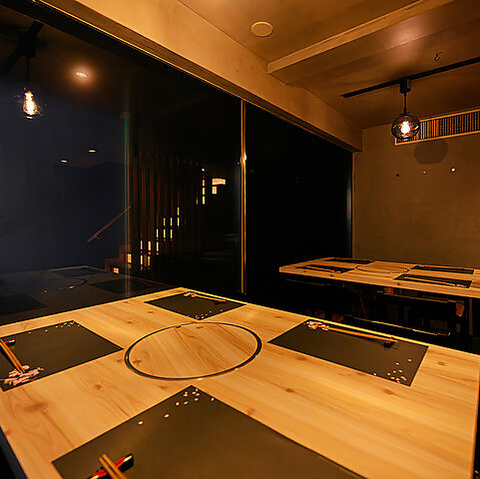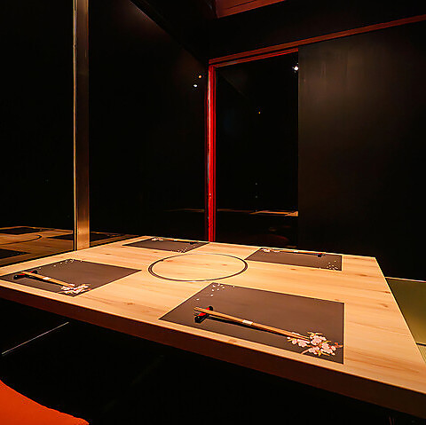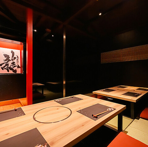 2名様、4名様、8名様まで多種多様な個室を完備。甲冑や刀、掛け軸を飾り、日本らしさを醸し出す黒と朱色のコントラストが美しい空間です。デートなどプライベートでのご利用から宴会まで様々なシーンでご利用いただけます。