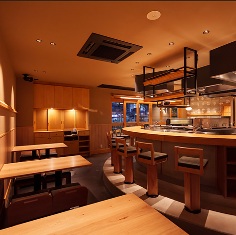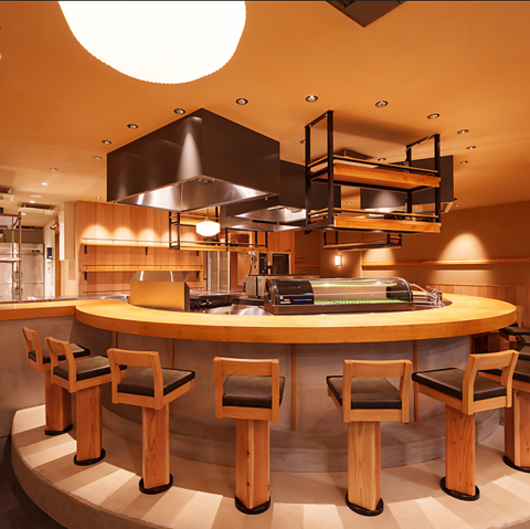 円形のカウンター席では、目の前で焼き上がる串焼きをライブでお楽しみいただけます!炭火の香ばしい香りや、焼き職人の手さばきを間近で観察しながら、アツアツの焼き鳥を味わえます。一人飲みや友人との語らいにも最適な空間です。