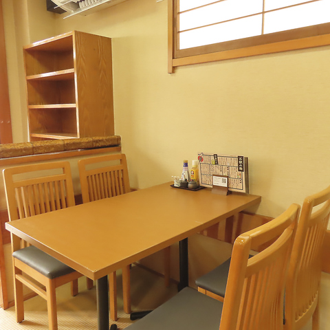 店内は座敷の上にテーブルを設置したスタイル。障子や木のぬくもりを感じる設えが落ち着いた雰囲気を演出します。テーブル席は2名用・4名用があり、組み合わせ次第でグループ利用も可能。和の空間でゆっくりとくつろげる居心地の良さが魅力です。
