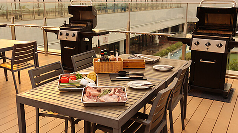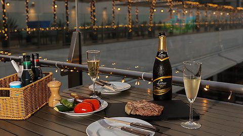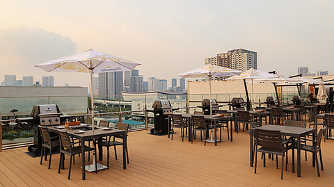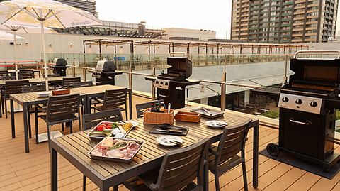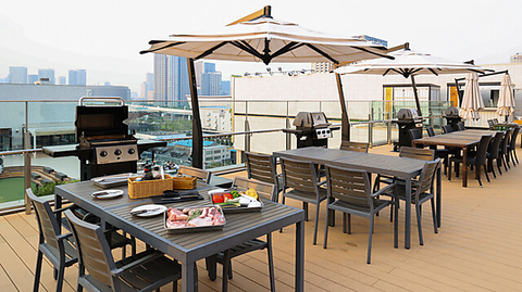 都会の青空や街並みを一望できるルーフトップテラス席。自慢のお肉をはじめ、本格的なイタリアンBBQをどなた様でも手ぶらでお気軽にお楽しみいただけます!