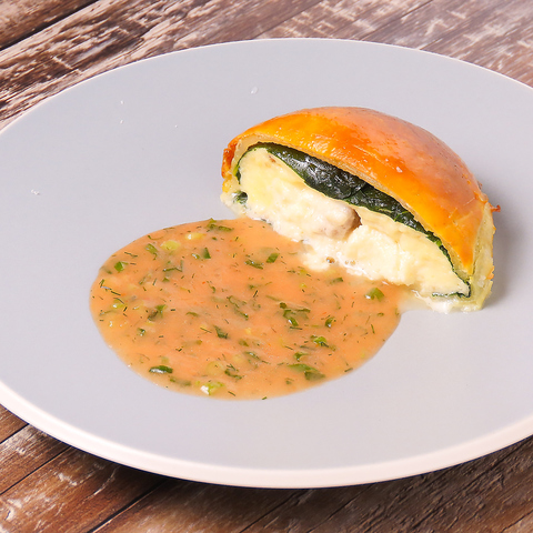 当店自慢の一品で、豊かな海の恵みを贅沢に味わえる料理です。ふわふわの鯛のムースをパイ生地で包み、こんがりと焼き上げました。外はサクサク、中はクリーミーな食感が絶妙なハーモニーを生み出します。鯛の旨味と豊かな風味が口いっぱいに広がり、思わず笑顔がこぼれる美味しさです。