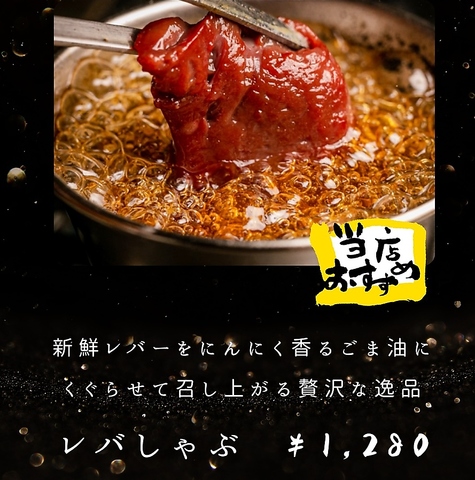 新鮮レバーをにんにく香るごま油にくぐらせて召し上がる贅沢逸品です。レバーの一番美味しい食べ方を満喫!