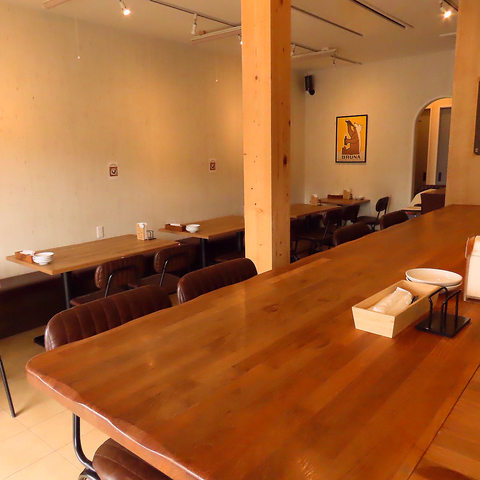 店内は木目を基調とした温かみのある空間。昼は自然光が差し込み、夜は落ち着いた照明で、時間帯ごとにことなる雰囲気を楽しめます♪