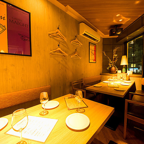 お洒落な内装と間接照明が心地よい雰囲気は、初めての方でもリラックスできる空間です。テーブル席はデートやご友人との食事に人気で、ディナータイムはムーディーな雰囲気。2階には半個室も完備し、プライベートな時間を大切にしたいお客様にも最適です。創作和食は、接待やお祝いの席でも自信を持っておすすめできます。