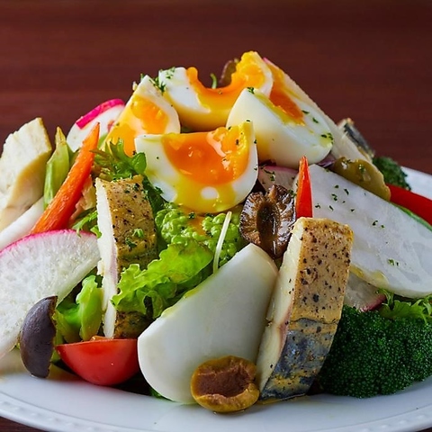 店主自慢の手作り前菜を贅沢に全部盛り合わせでご提供。牡蠣と長ネギのコンフィや本日の鮮魚のカルパッチョ、厳選生ハムなど彩りも味も豊かな前菜をご用意。お気に入りの前菜はおかわりも◎