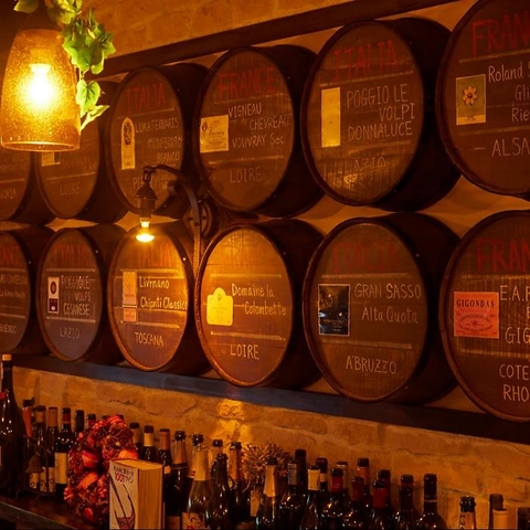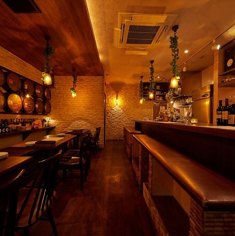 ワインボトルや樽がディスプレイされた店内は『ワイン貯蔵庫』をイメージ。大人の寛ぎ空間で楽しいお食事を
